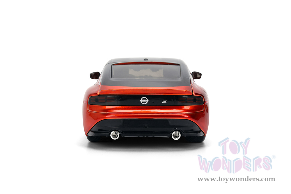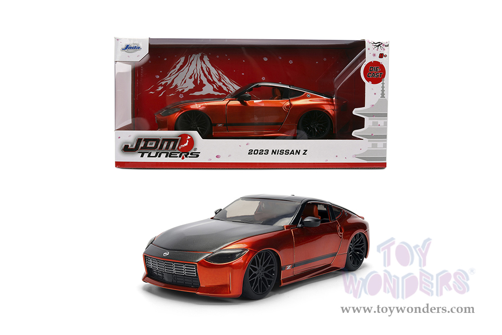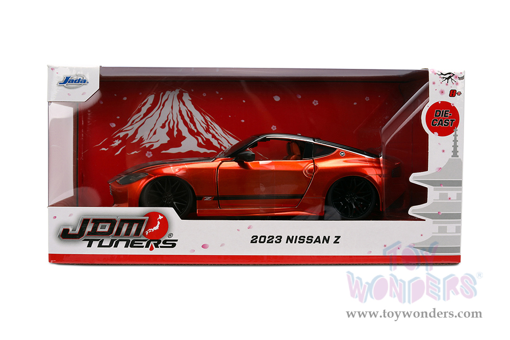 37490 Jada Toys JDM Tuners™ -  2023 Nissan Z Hardtop. 1:24 scale diecast collectible model car. This Nissan is an 8"L x 3.125"W x 2.25"H diecast metal cars with freewheeling, openable doors, trunk, and hood. This car is manufactured by Jada Toys. It comes individually packed in a window box. Window box is 10"L x 4.75"W x 4.75"H. Item 37490 is in copper with black hood.