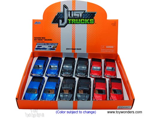 97015 Jada Just Trucks - 2013 Dodge Ram 1500 Pickup. 1:32 scale diecast collectible model car. 2013 Dodge Ram 1500 is a 5.25"L x 2"W x 1.75"H diecast metal with opening doors. This 2013 Dodge Ram is manufactured by Jada Toys. Just Trucks line. 97015 is in assorted colors. 12 pcs per display box, 88 pcs per inner.