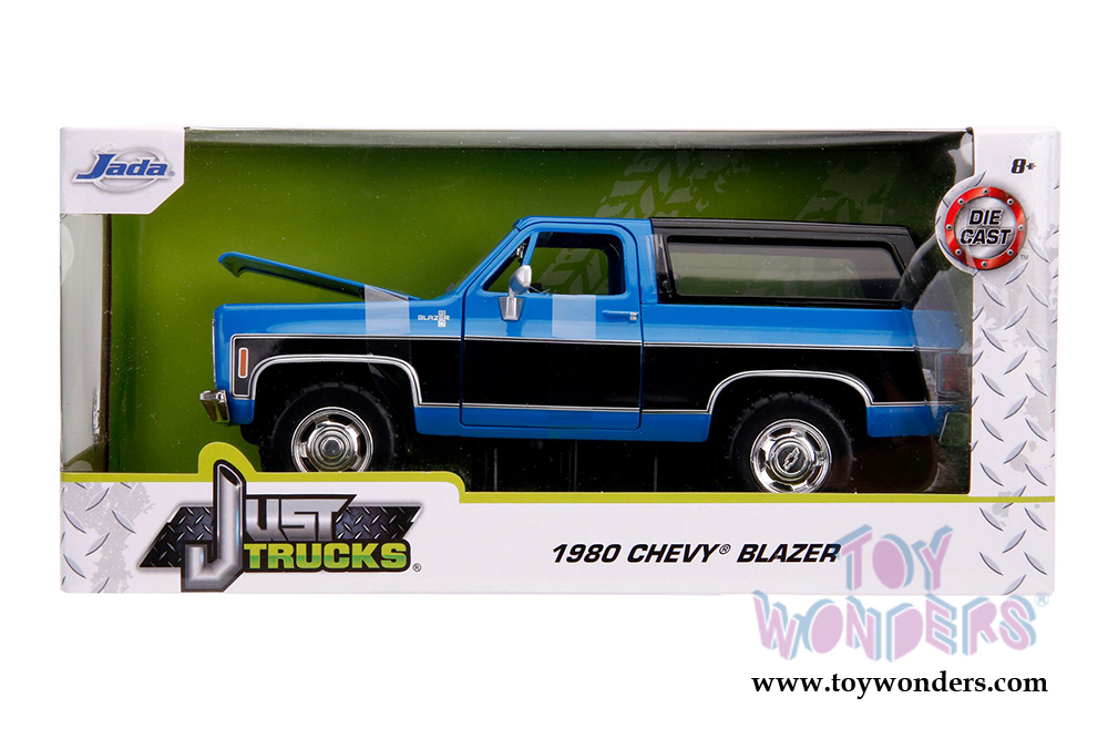 31598 Jada Toys Just Trucks - 1980 Chevrolet® Blazer K5 Off Road. 1:24 scale diecast collectible model car. This Chevy® Truck is an 8"L x 4"W x 3.25"H diecast metal car freewheeling, openable doors, hood and tailgate. Has removable camper. This Chevy® Blazer is manufactured by Jada Toys. 31598 is in Glossy Blue with black. Individually packed in a Window Box WB. Box size: 10"L x 4.75"W x 4.75"H.