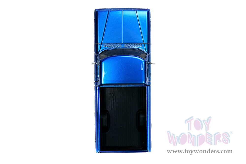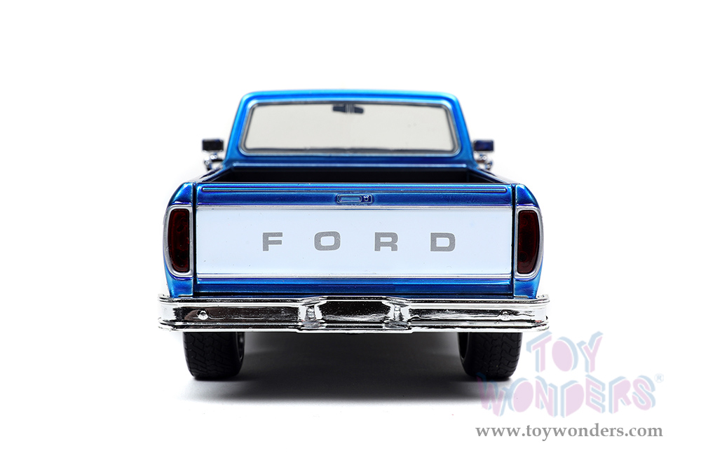 32309 Jada Toys Just Trucks - 1979 Ford F-150 Custom Pickup Truck with Extra Wheels. 1:24 scale diecast collectible model cars. This Ford F-150 is an 8.5"L x 3.5"W x 2.75"H diecast metal with openable hood, doors and tailgate. Each box contains one vehicle, one tire rack, 1 screwdriver, 2 extra axles and 4 extra wheels. These cars are manufactured by Jada Toys. Individually packed in a window box WB. Box size: 12.5"L x 5"W x 5"H. 32309 is in Candy Blue with White.