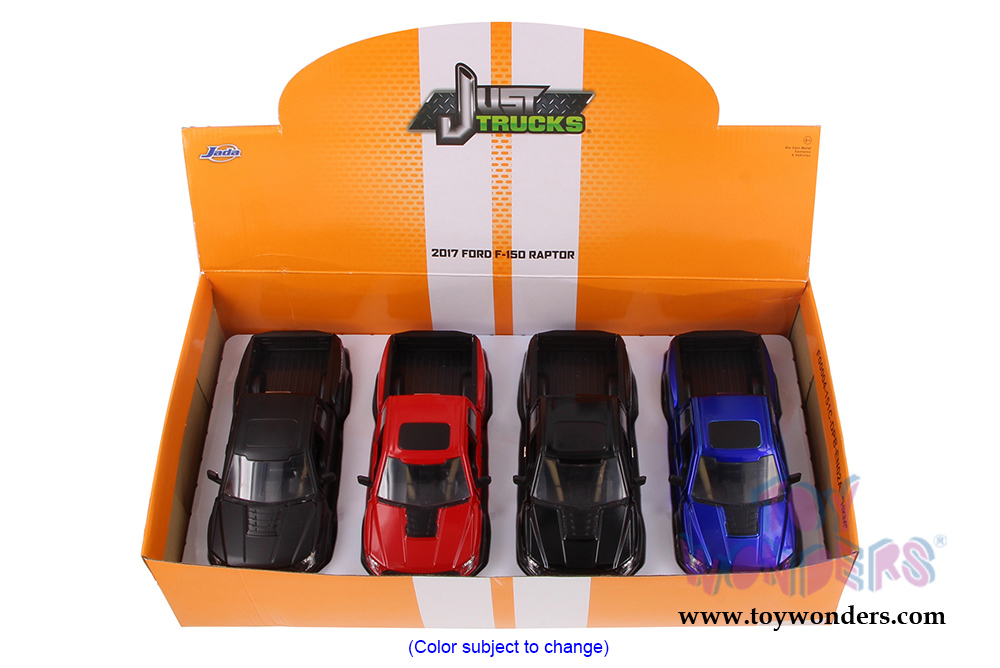98586DP1 Jada Toys Just Trucks - 2017 Ford F-150 Raptor Pickup Truck. 1:24 scale diecast collectible model car. This Ford F150 Raptor Pick-up is an 8.75"L x 3.5"W x 3.25"H die cast with openable doors, hood & tailgate. Rims: Ro Ja GTM. This Ford F 150 Raptor Pick up is manufactured by Jada Toys. 4 pcs per display in assorted colors. 12 pcs per inner box.