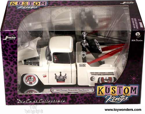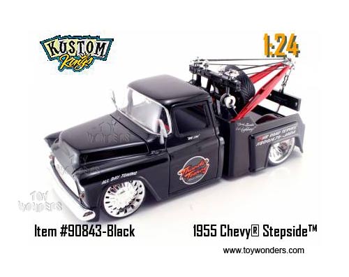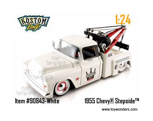 90843AR/4 JADA Toys Kustom Kings - 1955 Chevy Stepside Tow Truck. 1:24 scale diecast collectible model car. The Chevrolet Step Side wrecker is an 8.75"Lx 3.75"Wx 3.5"H die cast metal car with openable hood & doors. Rims: Babymoon Disc. Free wheeling. Details & chromed-out engine. This 1955 Chevy Stepside tow truck is manufactured by Jada Toys. Individaully packed in a window box. Box size: 10"Lx 5.25"Wx 6.25"H. 90843 in assorted colors. GM is a trademark of the General Motors Corporation.
