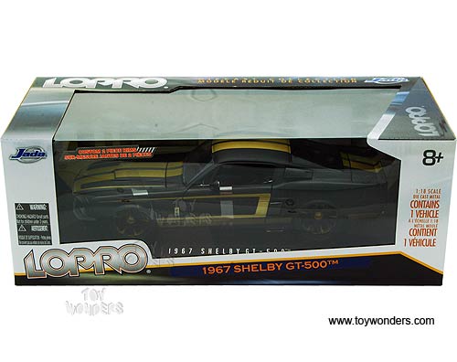 96626 Jada Toys LoPro - 1967 Shelby GT500 Hard Top. 1:18 Scale diecast collectible model car. This Shelby GT-500 is a 10.75"L x 3.75"W x 2.75"H  diecast metal car with openable hood, doors & trunk. Sits on a display plaque. This 67 Shelby GT500 is manufactured by Jada Toys. Individually packed in a window box. Box size: 14.25"L x 6.75"W x 5.25"H. Item 96626 is in BLACK color with gold stripes.