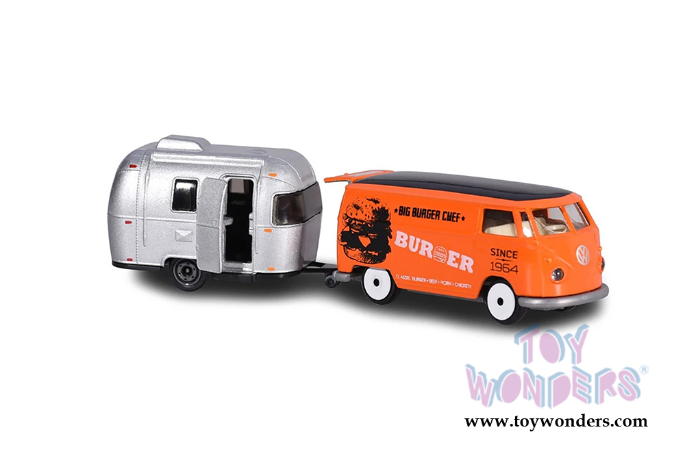 2120520141JA Jada Toys - Majorette Trailer Set Assortment. 1:64 scale diecast collectible model car set. This car set comes with 2.75" long Cars and trailers. Detailed exteriors, interiors. Volkswagen Beetle has opening frunk. Mercedes G63 has opening trunk. Volkswagen T1 has opening rear gate. These car sets are manufactured by JADA. Individually packed in a window box. Window Box measures 7"L x 2"W x 1"H. In assorted colors.