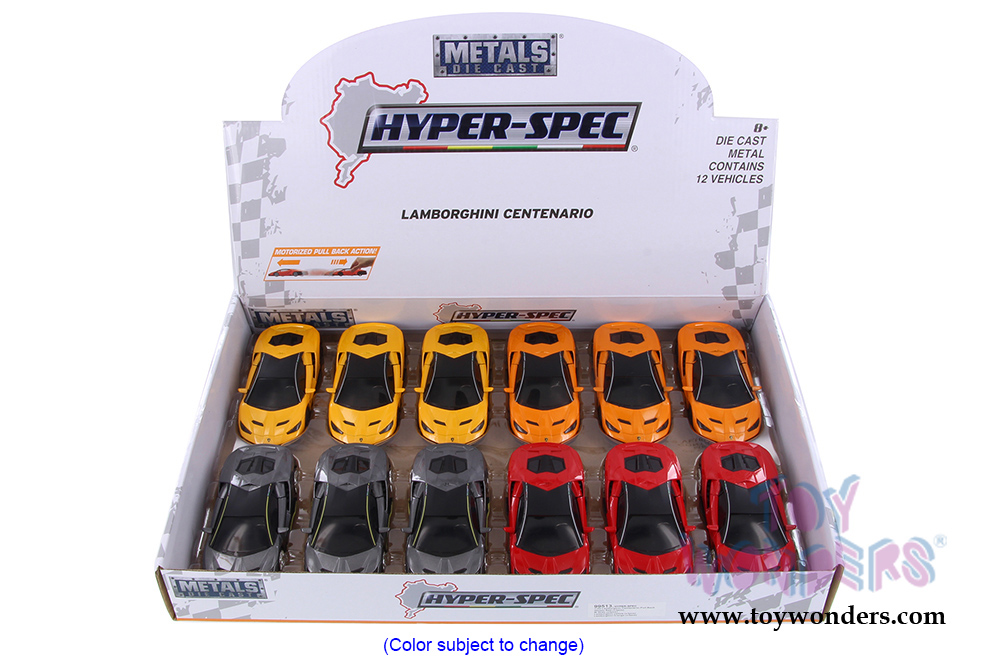 99513DP1 Metals Die Cast | Hyper-Spec 2017 Lamborghini Centenario Hardtop. 1:32 scale diecast collectible model car. This Lamborghini is a 5.25"L x 2.25"W x 1.25"H diecast metal cars with openable doors and pullback action. This car is manufactured by Jada Toys. 12 pcs per display box in assorted colors. 60 pcs per inner.