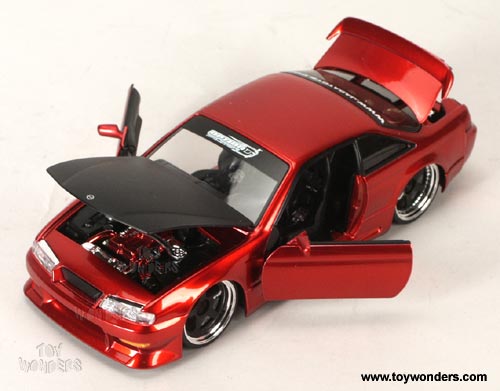 90616HT Jada Toys Option D - 1998 Nissan 240SX (S-14) Hard Top. 1:24 scale diecast model car. 8" long x 3.75"W x 2.25"H die cast sports car. Opening doors/hood/trunk. Details & chromed-out engine. Rims: Work Meister S1. Jada Toys. OptionD. 4 pcs per display box. 90616 in assorted colors.