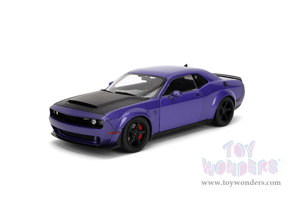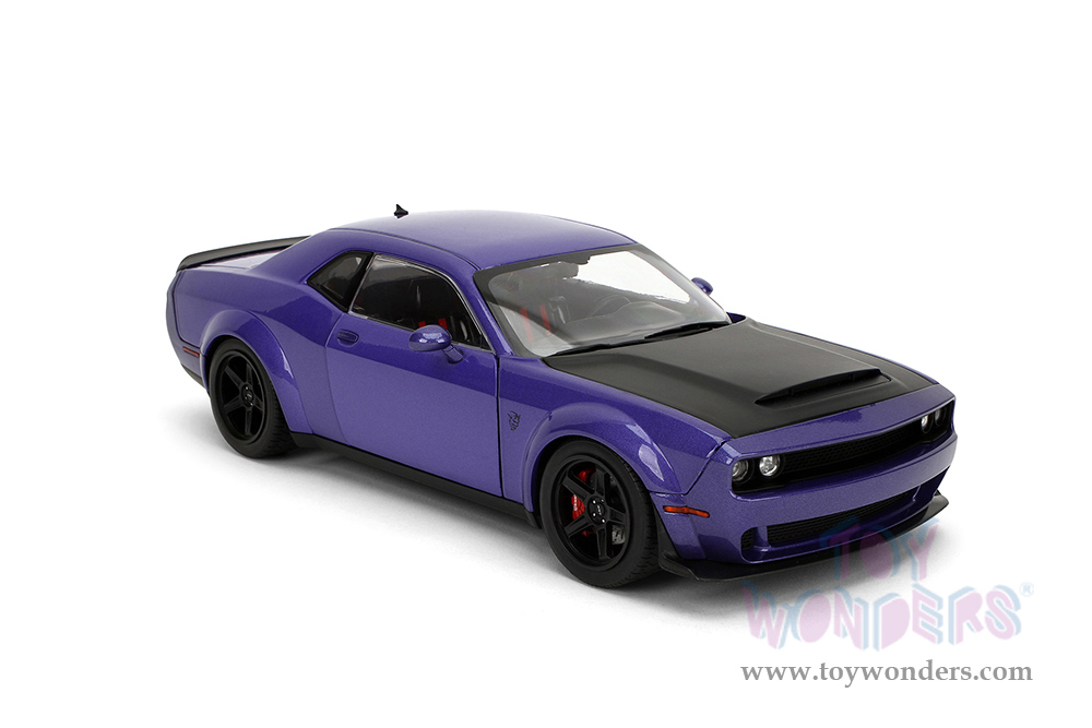 36473 Jada Toys Pink Slips - Dodge Challenger SRT Demon with Display Base. 1:18 scale diecast collectible model car. This Dodge Challenger is a 10.5"L x 4.75"W x 3"H diecast metal car with openable doors and a Pink Slips branded base. This Dodge Challenger is manufactured by Jada Toys. 36473 is in metallic purple and matte black hood. Individually packed in a Window Box WB. Box size: 12.5"Lx 6"Wx 5.5"H.