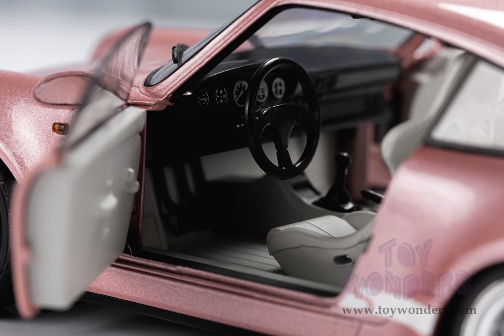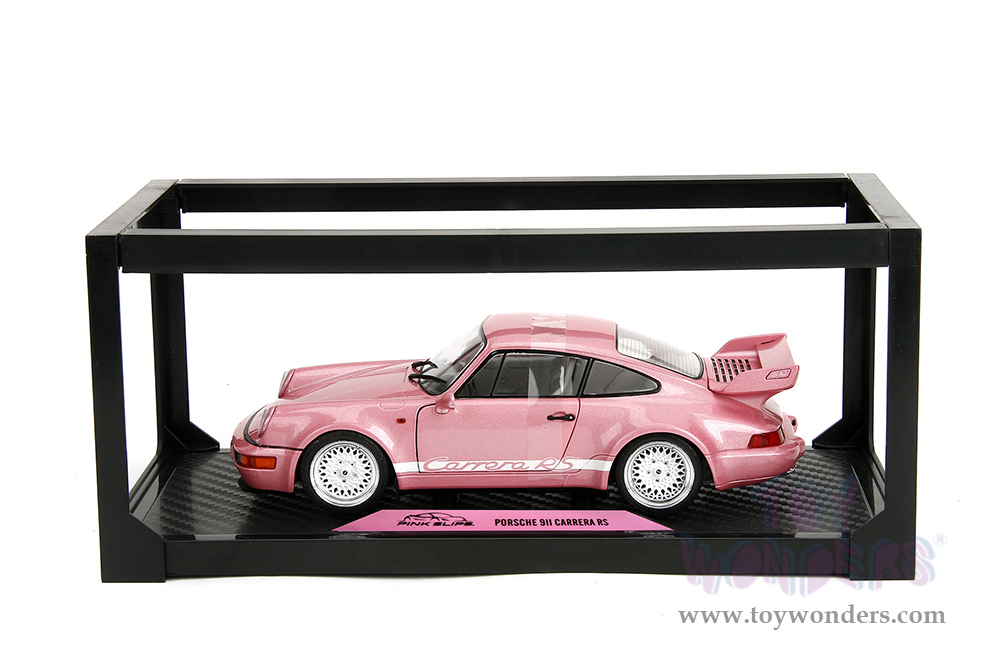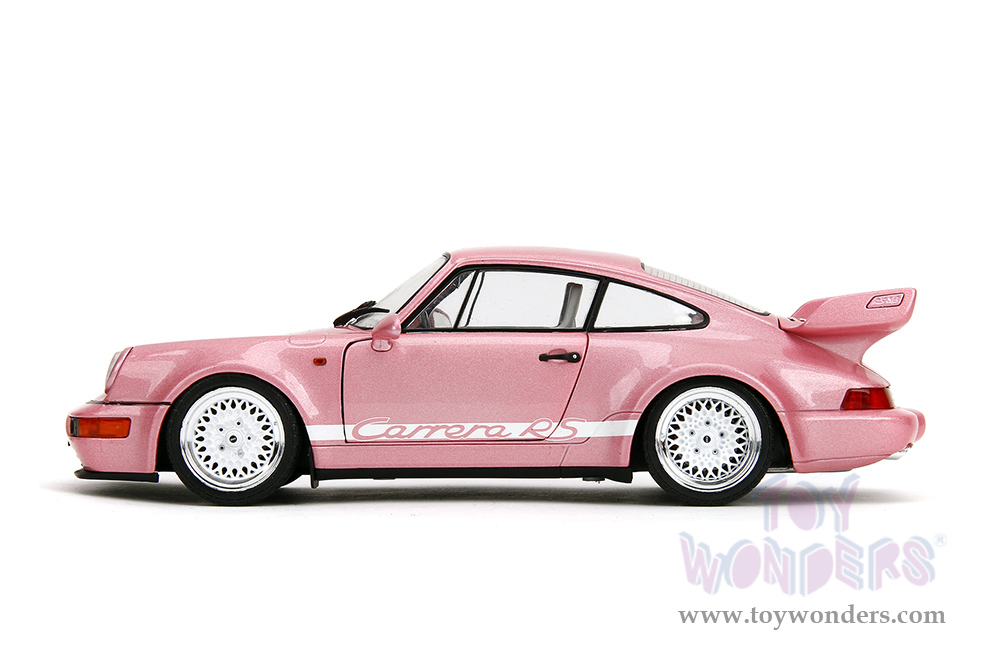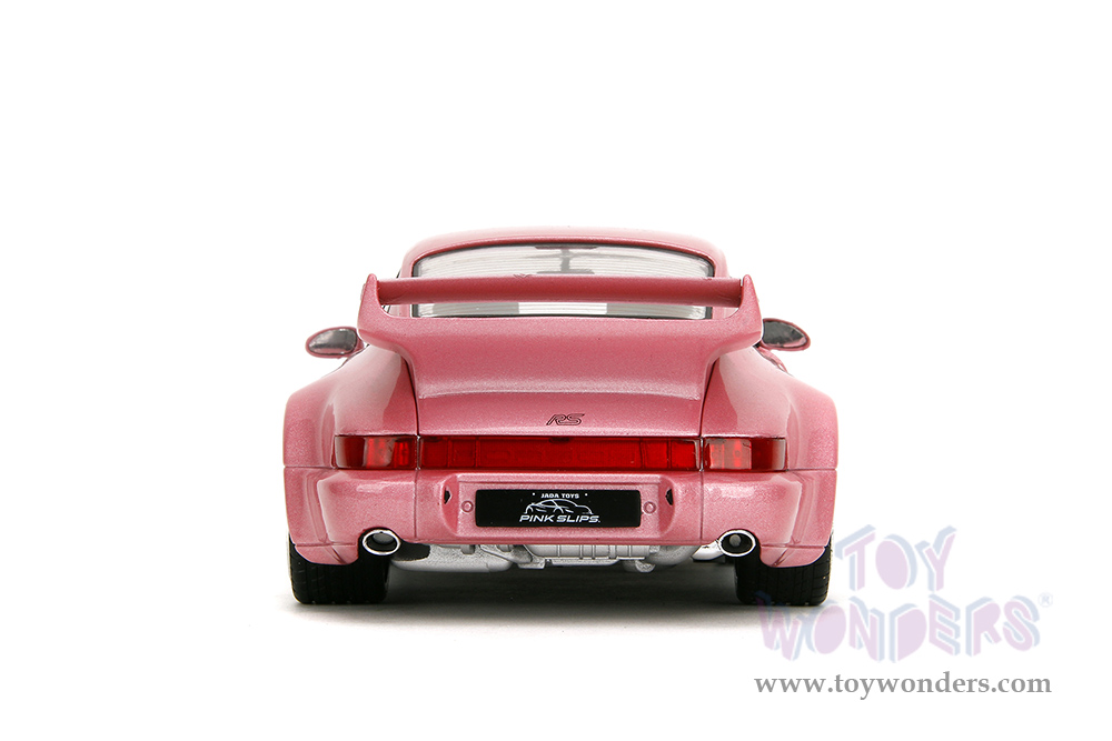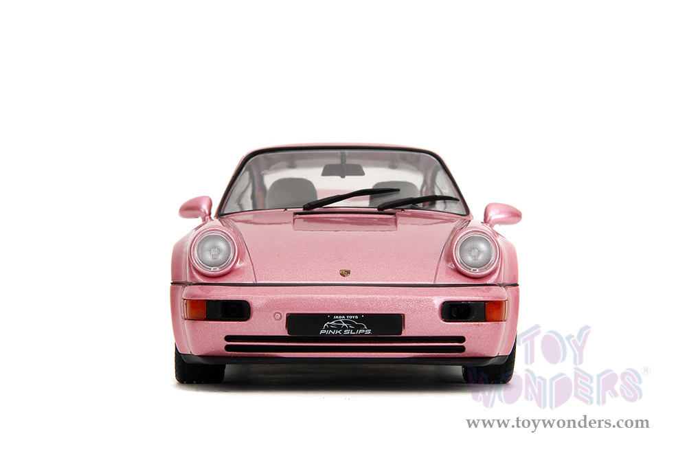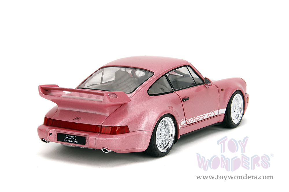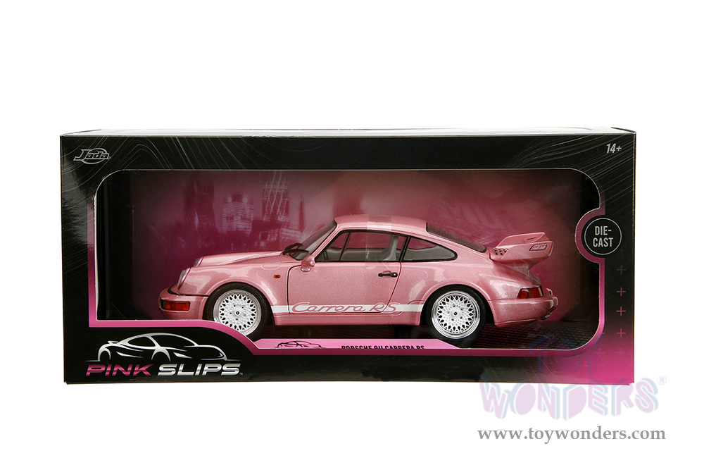 35727 Jada Toys Pink Slips - Porsche 911 Carrera RS (964) with Display Base. 1:18 scale diecast collectible model car. This Porsche is a 9"L x 4.125"W x 2.25"H diecast metal car with openable doors and a Pink Slips branded base. This Porsche Carrera is manufactured by Jada Toys. 35727 is in metallic pink with white stripes. Individually packed in a Window Box WB. Box size: 12.5"Lx 6"Wx 5.5"H.