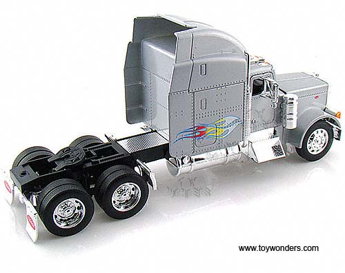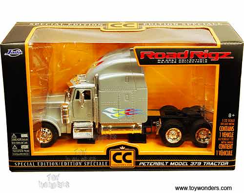 23100 Jada Toys RoadRigz - Peterbilt 379 Model Tractor Trailer Cab. 1:32 scale diecast collectible model car. This Peterbilt 379 is a 10.75"Lx 3"Wx 4.75"H die cast metal car with openable hood & doors. Free wheeling. This Peterbilt 379 truck is manufactured by Jada Toys. Individually packed in a window box. Box size: 12"Lx 4.75"Wx 7"H. 23100 is in SILVER color with flames.