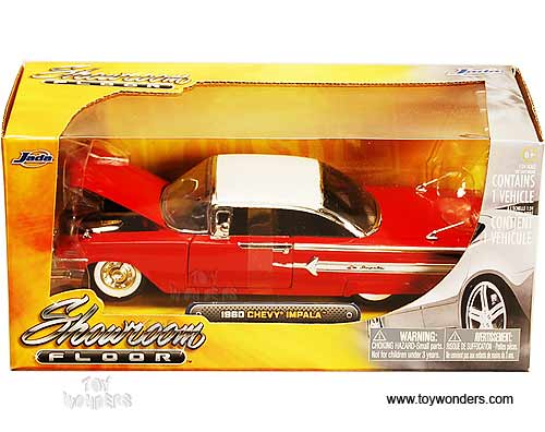 92368 Jada Toys Showroom Floor - 1960 Chevy Impala Hard Top. 1:24 scale diecast collectible model car. This Chevrolet Impala is an 8.75"L x 3.25"W x 2"H die cast metal car with openable doors & hood. This 60 Chevy Impala is manufactured by Jada Toys. Individually packed in a window box WB. Box size: 10"L x 4.75"W x 4.75"H. 6 pcs per inner box. GM is a trademark of the General Motors Corporation.