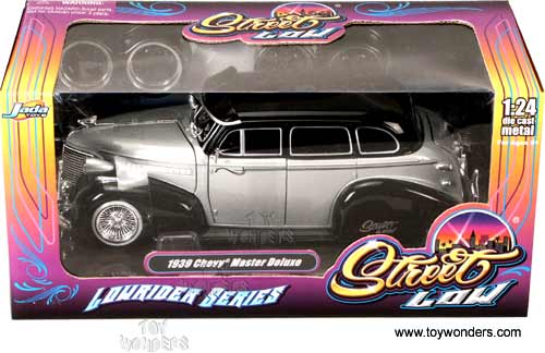91068 Street Low - 1939 Chevy Master Deluxe. 1:24 scale diecast model car. 8" long x 3"Wx 2.75"H diecast metal, free wheel with opening doors, hood and truck. It comes with extra wheels. Individually packed in a window box WB. Box size: 9.75"Lx 4.75"Wx 4.75"H. Streetlow lowrider series. This Chevrolet is manufactured by Jada Toys. 6 pcs per inner box. GM is a trademark of the General Motors Corporation.