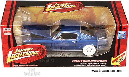 CC53572BU Johnny Lightning Chase Car - 1965 Ford Mustang Hard Top. 1:24 scale diecast collectible model car. This Ford Mustang is a 7.25"x 2.75"Wx 2"H die cast metal car with openable doors & hood, detailed interior & authentic engine, and diecast chassis. This 1965 Ford Mustang Chase car is manufactured by RC2 Brands. Individually packed in a window box WB. Box size: 10"Lx 4.5"Wx 4"H. CC53572 chase car is in BLUE color with White wheels (Regular production model has black wheels.)