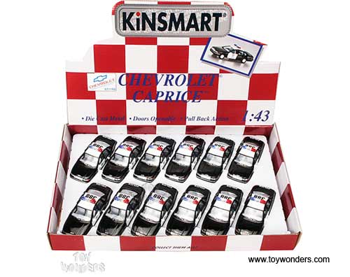 5025DK Kinsmart - Chevrolet Police Cars. 1:43 scale diecast car. These Chevy police vehicles are 5" diecast metal with pullback action and openable doors. These Chevy emergency police cars are manufactured by Kinsmart. 12 pcs per display box. 72 pcs per inner box. BLACK color.