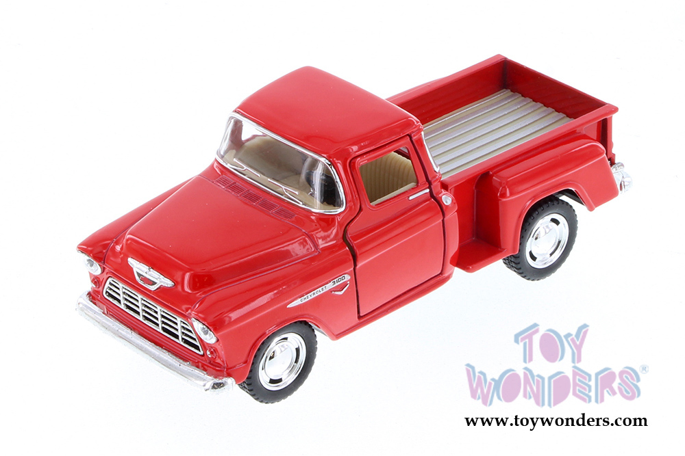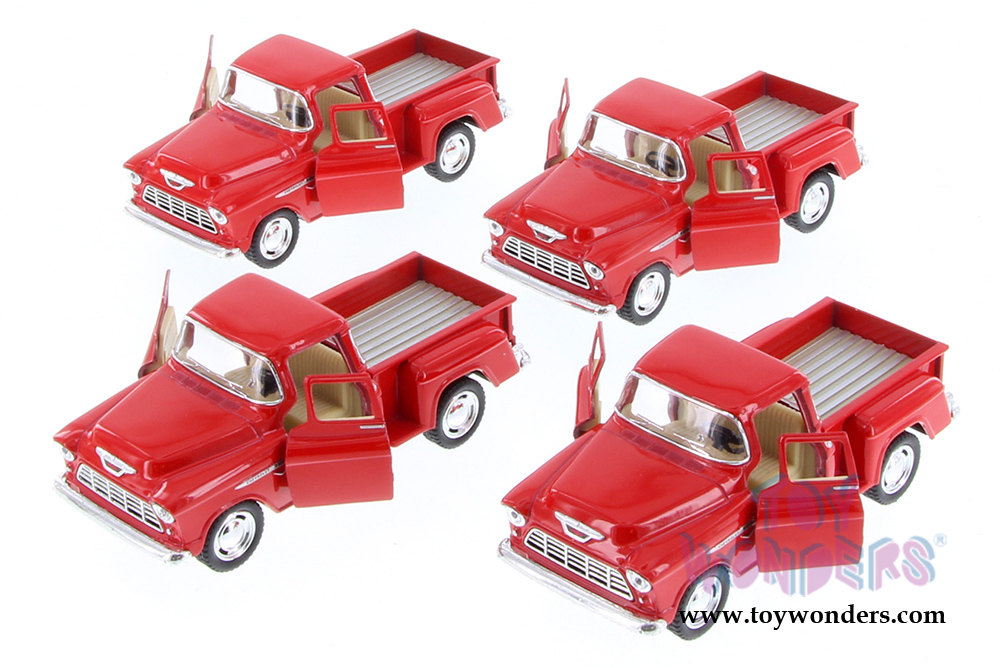 5330DR Kinsmart - 1955 Chevy Stepside Pickup Truck. 1:32 scale diecast collectible model car. The Chevrolet Stepside pick up is a 4.75"L x 2"W x 1.75"H die cast metal car with openable doors, and pullback motor action. This 55 Chevy Stepside pick-up is manufactured by Kinsmart. 12 pcs per display box and in RED color. 72 pcs per inner box. GM is a trademark of the General Motors Corporation.