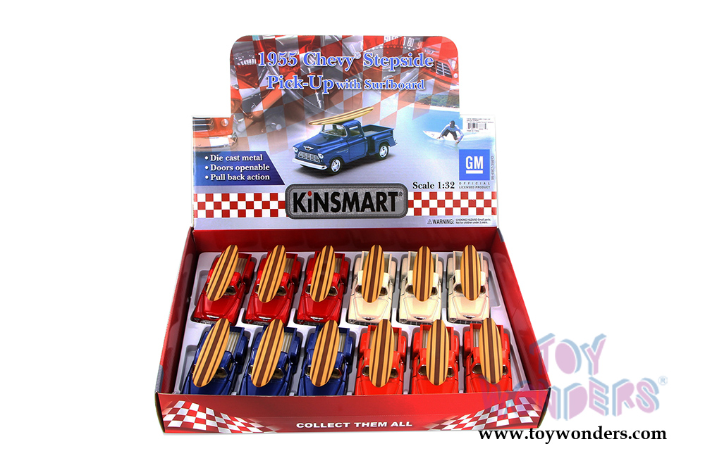 5330DS1 Kinsmart - 1955 Chevy Stepside Pickup Truck with Surfboard. 1:32 scale diecast collectible model car. The Chevrolet Stepside pickup is a 5"L x 2"W x 2.25"H diecast metal car with openable doors and pullback motor action. This 55 Chevy Stepside pickup is manufactured by Kinsmart. 12 pcs per display box and in assorted colors. 72 pcs per inner box. GM is a trademark of the General Motors Corporation.