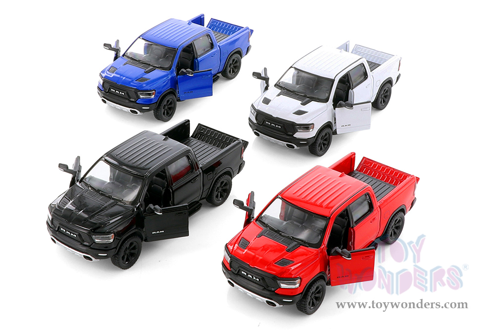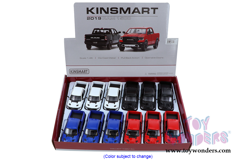 5413D Kinsmart - 2019 Dodge Ram 1500 Pick-Up truck. 1:46 scale diecast model car. This Dodge Pickup is 5"Lx 2"Wx 1.75"H die-cast metal with pullback motor action Dodge Ram pickup truck. Features opening doors and tailgate. These Dodge Ram pick ups are manufactured by Kinsmart. 12 pcs per display box. 5413D is in assorted colors. 72 pcs per inner box.