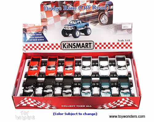 5338D Dodge Ram (Off Road) Pick-Up truck. 1:44 scale diecast collectible model car. This big wheel Dodge Ram pickup is a 4.75"L x 3"W x 2.75"H die-cast metal car with openable doors and tailgate, pullback motor action. This Dodge Ram off-road pick up is manufactured by Kinsmart. 12 pcs per display box in assorted colors. 48 pcs per inner box. Z8