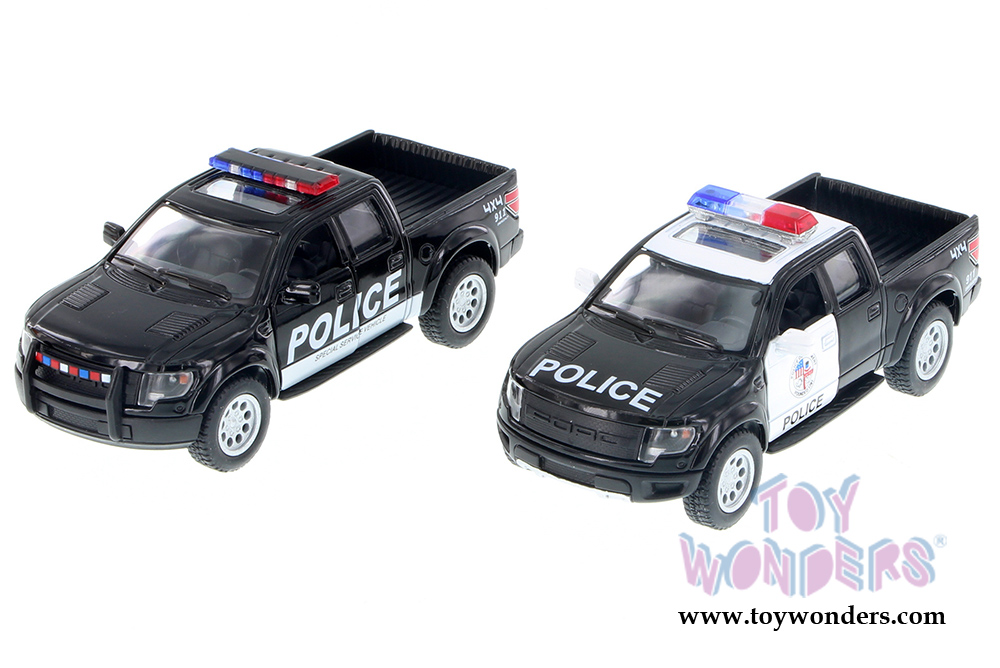 5365DPR/P Kinsmart - 2013 Ford F-150 SVT Raptor SuperCrew Pickup with Sunroof - Police/Fire Rescue 1:46 scale. This  Ford F-150 SVT is a 5"L x 2"W x 1.75"H diecast metal pickup truck features pullback motor action, opening doors and tailgate. Police trucks. Manufactured by Kinsmart. 12 pcs per display box in assorted colors. 72 pcs per inner box.