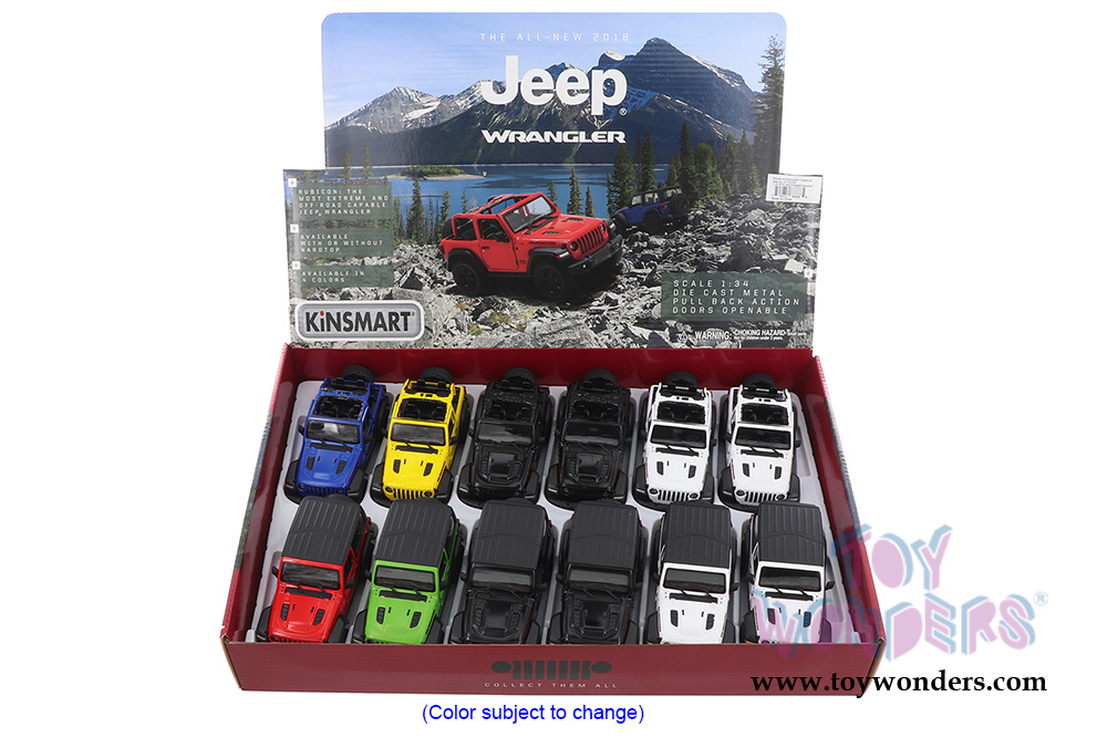 5412D/HK Kinsmart - 2018 Jeep® Wrangler Rubicon Assortment. 1:34 scale diecast collectible model car. This 2018 Jeep® Wrangler is a 5"L x 2.25"W x 2.25"H diecast metal collectible car features opening doors and pullback motor action. Manufactured by Kinsmart. 12 pcs per display box in assorted colors. 72 pcs per inner box.