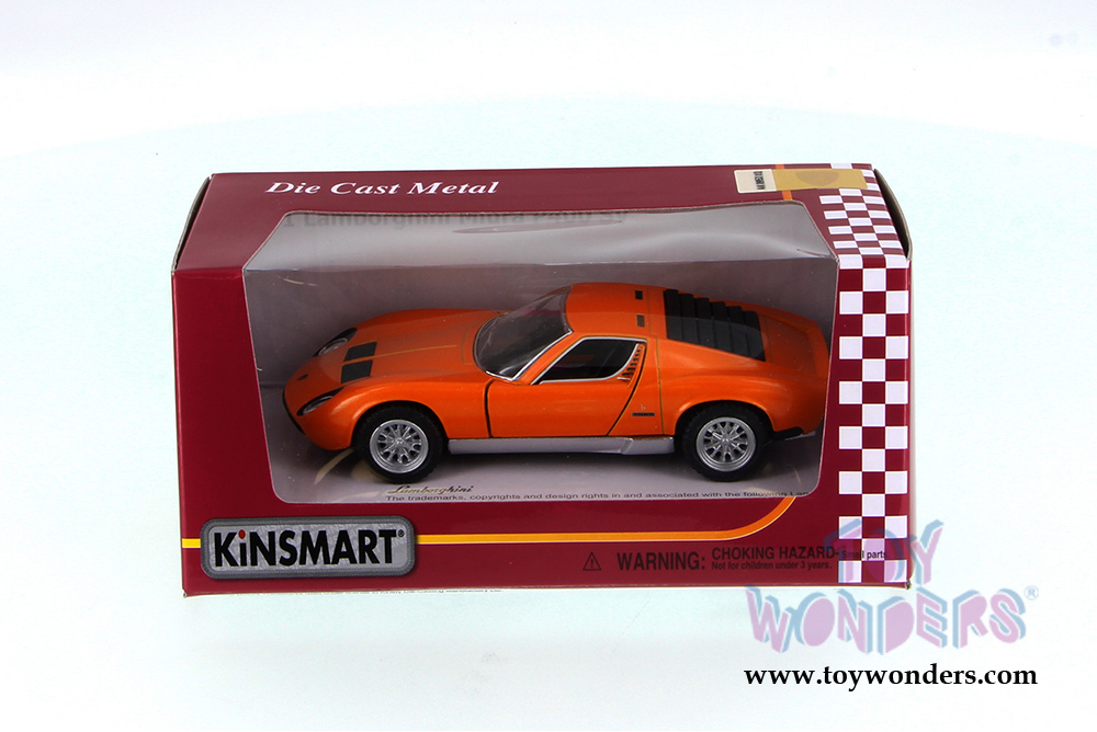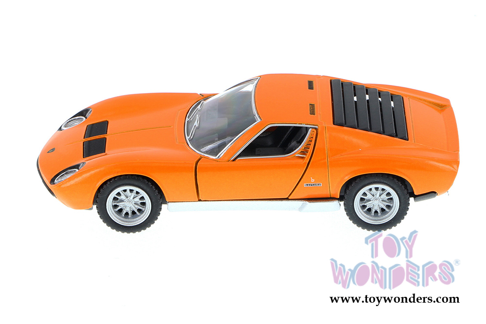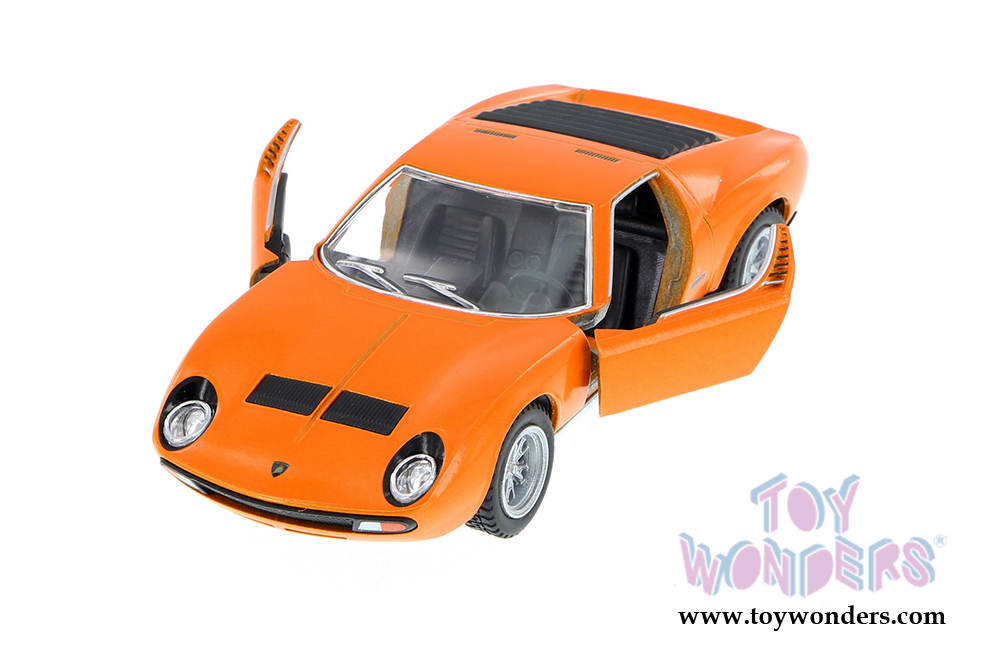 Lamborghini Miura die cast metal car features pull-back motor action and opening doors.