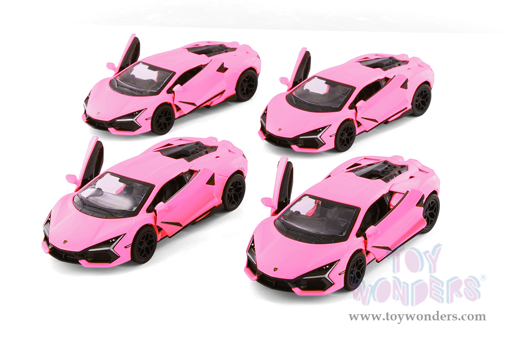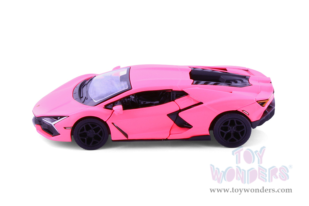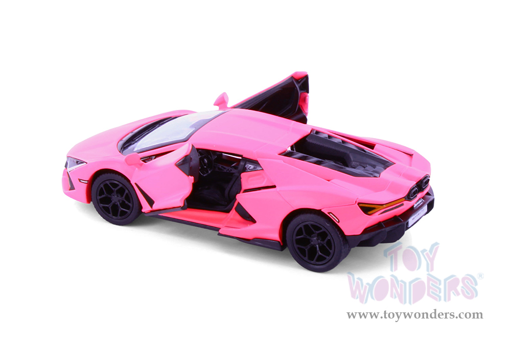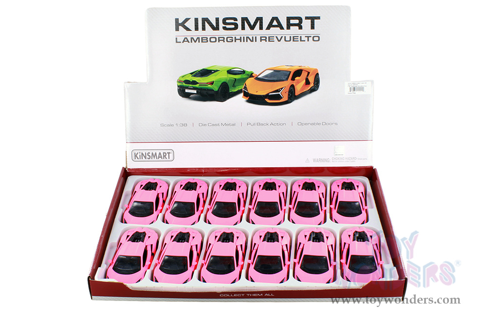 5459DPK Kinsmart - Lamborghini Revuelto Hardtop. 1:38 scale diecast collectible model car. This Lamborghini is a 5"L x 2"W x 1.25"H diecast metal car with pullback action and openable doors. This Lamborghini Revuelto is manufactured by Kinsmart. Display of 12 pcs in matte hot pink color. Inner box: 72 pcs.