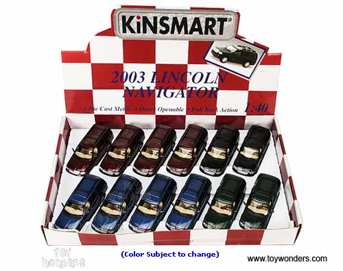 5063D Kinsmart - 2003 Lincoln Navigator SUV. 1:40 scale diecast collectible model car. These Lincoln Navigator are 5" long die cast SUVs with pullback motor action and openable doors. These Lincoln sports utility vehicles are manufactured by Kinsmart. 12 pcs per display box and in assorted colors. 72 pcs per inner box.