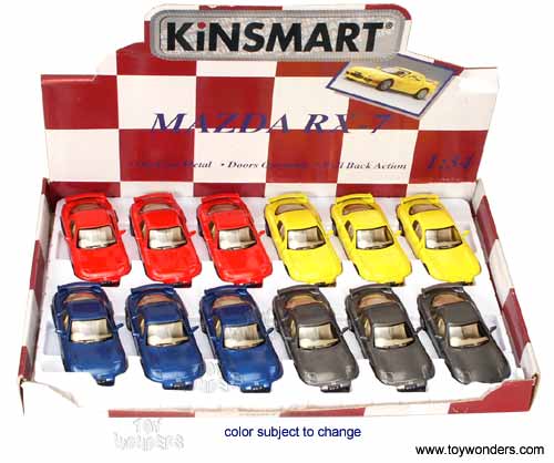 5067D Kinsmart - Mazda RX 7. 1:34 scale diecast model sports car. This 4.75" diecast metal Mazda RX7 has pullback action and openable doors. This Mazda RX-7 is manufactured by Kinsmart. 72 pcs per inner box. 12 pcs per display box. 5067 in assorted colors.