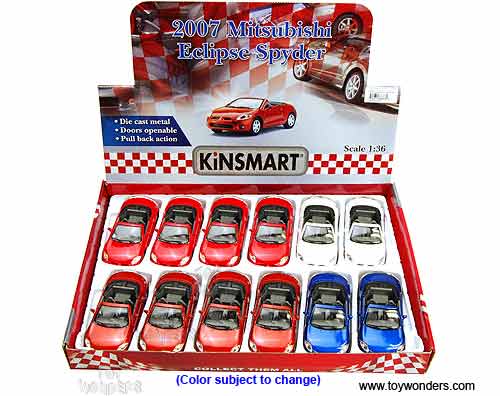 5305D Kinsmart - Mitsubishi Eclipse Spyder Convertible. 1:36 scale diecast collectible model car. This Mitsubishi Eclipse is a 5"Lx 2"Wx 1.3"H die cast metal car with openable doors and pullback action. This Mitsubishi Eclipse Spyder is manufactured by Kinsmart. 12 pcs per display box and in assorted colors. 72 pcs per inner box.