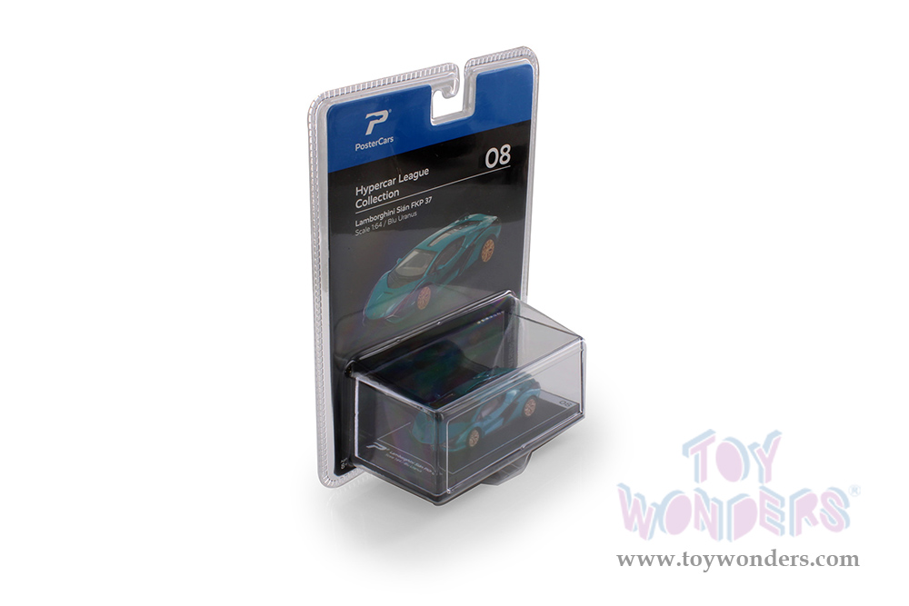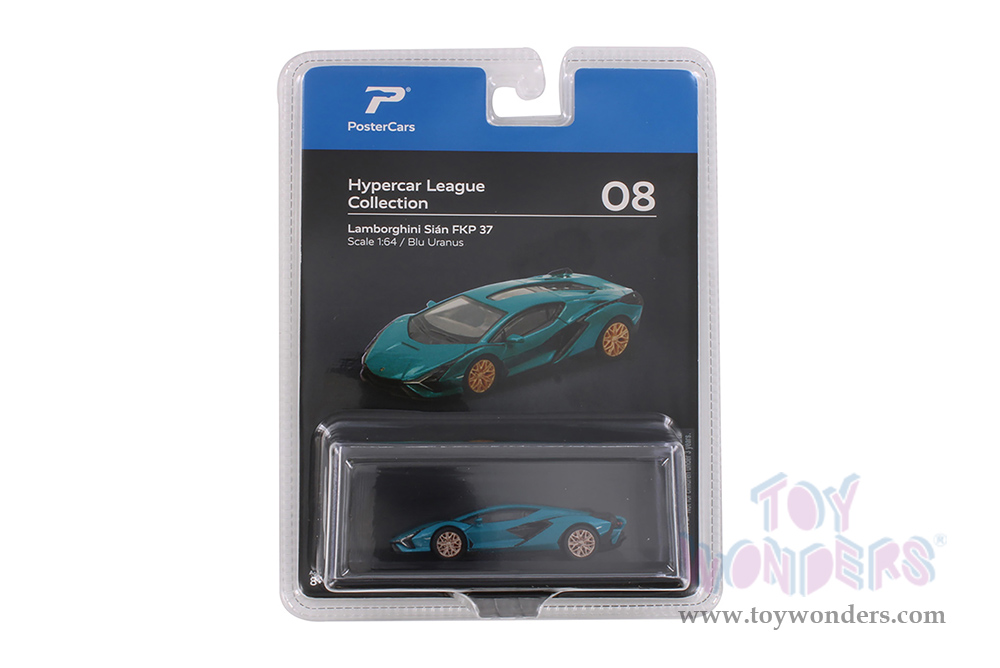 Kinsmart - PosterCars Hypercar League Collection | Lamborghini Sian FKP 37. 1:64 scale diecast model. This Lamborghini is a 2.75”L x 1.25”W x .75”H diecast metal car with freewheeling. Includes a display base and acrylic cover. Manufactured by Kinsmart. Individually packed in a blister card. Card size: 6"W x 7.75"H. H08B is in Blu Uranus. 96 pcs per inner box.