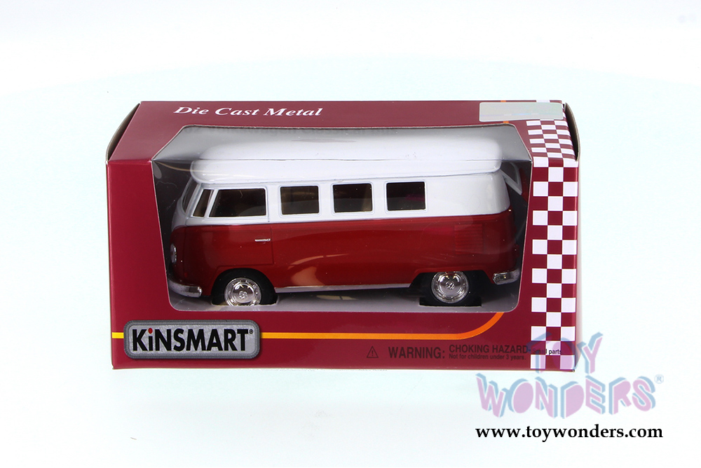 5060WR Kinsmart - 1962 Volkswagen Classic Bus. 1:32 scale diecast collectible model car. This 1962 VW Bus is a 5.25" long diecast metal classic with openable passenger door & rear hatch. This Volkswagen also comes with pullback motor action . This 62 VW Bus is manufactured by Kinsmart/ Kintoy. Item 5060WR is in RED color with Ivory Top. Individually packed in a window box. Box size: 6.25"L x 3.25"W x 2.75"H.