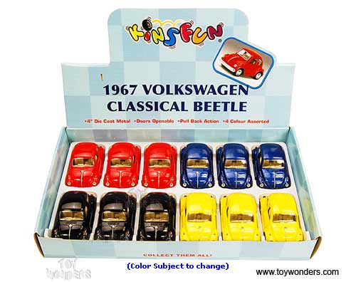 4026D Kinsmart - 1967 Volkswagen Classic Hardtop. This VW is a 3.75"L x 2"W x 2"H diecast metal car with openable doors and pull back action. This 1967 Volkswagen is manufactured by Kinsfun/ Kinsmart Toys. 12 pcs per display box in assorted colors. 72 pcs per inner.