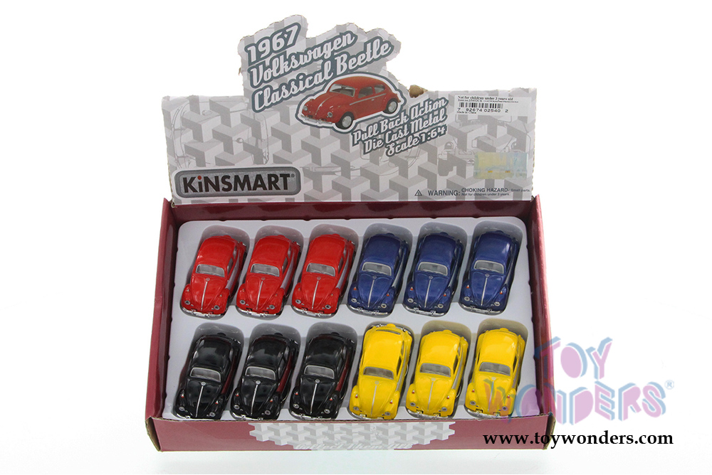 2540DCK Kinsmart - 1967 Volkswagen Classical Beetle with Key Chains. 1:64 scale diecast model. These Volkswagen Classic Beetles key chains are 2.5" long diecast metal two-tone cars with pullback motor action. These cute Volkswagen Beetles are manufactured by Kinsmart. 12 pcs per display box and in assorted metallic colors.  144 pcs per inner box.