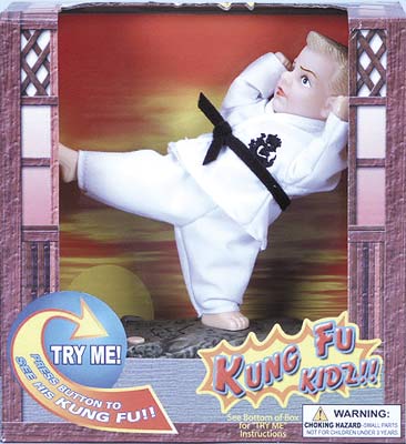 3701 Kung Fu Kidz (white uniform). 5" Kung Fu kid standing on a rock practicing his kung fu kicks with music. Kung Fu boy dressed in white uniform. "Try me" box. Includes 3 "AA" batteries. Box size: 6.75"W x7"H x 3.5"D.