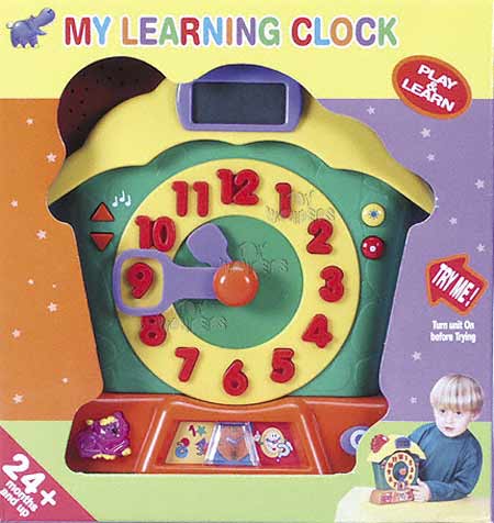 2330E Learning Clock (English). Three fun learning modes introduce time-relevant numbers, time telling, fun quiz games, electronic voice, animation and cheerful melodies. Large LCD screen shows time in discovery mode. "TRY ME" packaging. Includes 2 "AA" batteries. Box size: 9.75"W x 10.5"H x 3"W. 6 pcs/inner.