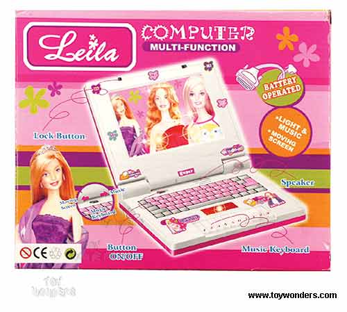 0662A/4 Battery Operated Leila Computer. Flip-open laptop. This notebook has lots of educational activities. The PC features music keyboard, speaker, light & music and moving screen. Requires 3 "AA" batteries (not included). Box size: 8.5"L x 7"W x 2"H. 24 pcs/inner.