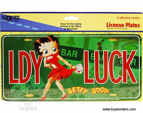 L12054 License Plate - Betty Boop Lady Luck Sign embossed aluminum metal sign. A collection of license plates. Great for decorating vehicles, homes, offices, restaurants, etc. Sturdy aluminum. This license plate is approximately 6" x 12" with shrink wrap and pre-drilled holes. Each license plate is individually blister carded. Card size: 12.1"L x 8"W.