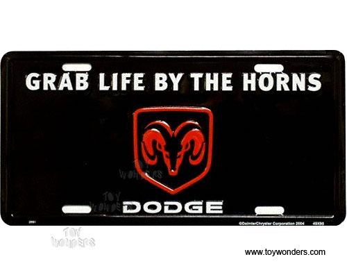 SLAD3 License Plate - Dodge-Grab Life by The Horns embossed aluminum metal sign. A collection of license plates. Great for decorating vehicles, homes, offices, restaurants, etc. Sturdy aluminum. This license plate is approximately 6" x 12" with shrink wrap and pre-drilled holes.