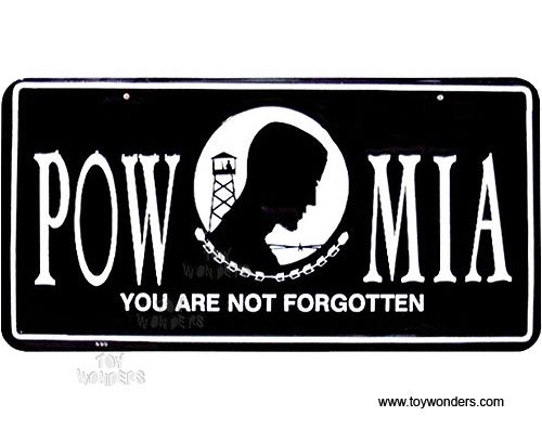 SL590 License Plate - POW-MIA - You Are Not Forgotten embossed aluminum metal sign. A collection of license plates. Great for decorating vehicles, homes, offices, restaurants, etc. Sturdy aluminum. This license plate is approximately 6" x 12" with shrink wrap and pre-drilled holes.