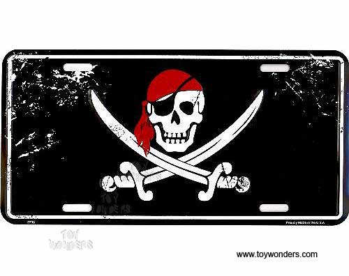 SLPSS License Plate - Pirate Skull Black embossed aluminum metal sign. A collection of skulls. Great for decorating vehicles, homes, offices, restaurants, etc. Sturdy aluminum. This license plate is approximately 6" x 12" with shrink wrap and pre-drilled holes.