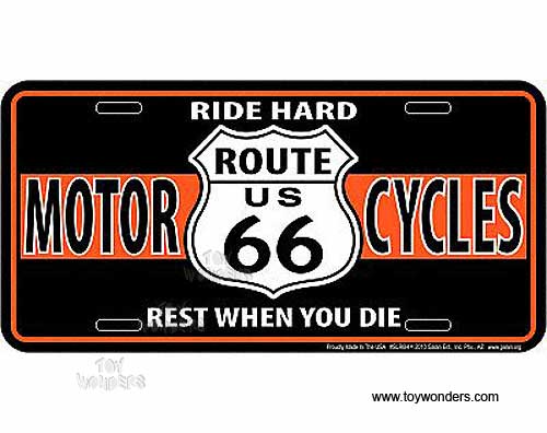 SLR6H License Plate - Route 66 Motorcycle embossed aluminum metal sign. A collection of Bike & US Highway Route-66. Great for decorating vehicles, homes, offices, restaurants, etc. Sturdy aluminum. This license plate is approximately 6" x 12" with shrink wrap and pre-drilled holes.