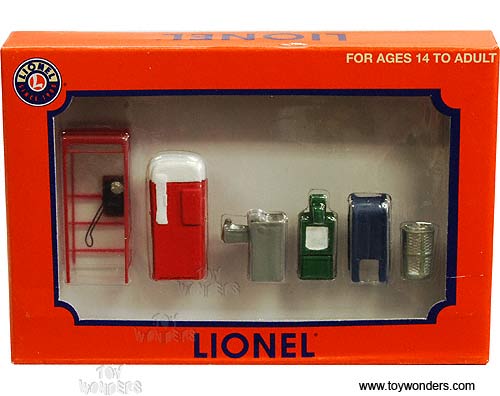 624197 Lionel Accesory - 6 pcs City Accessory Pack (O Scale or O Gauge). This City Accessory Pack includes telephone booth, trash can, mailbox, water drinking fountain, newspaper box & old fashion soda vending mechine. They are great for decorating model trains, cars and dioramas. Item 624197 is packed in a box. Box size: 6"L x 4"W x 1"H. This City Accessory Pack is manufactured by Lionel.