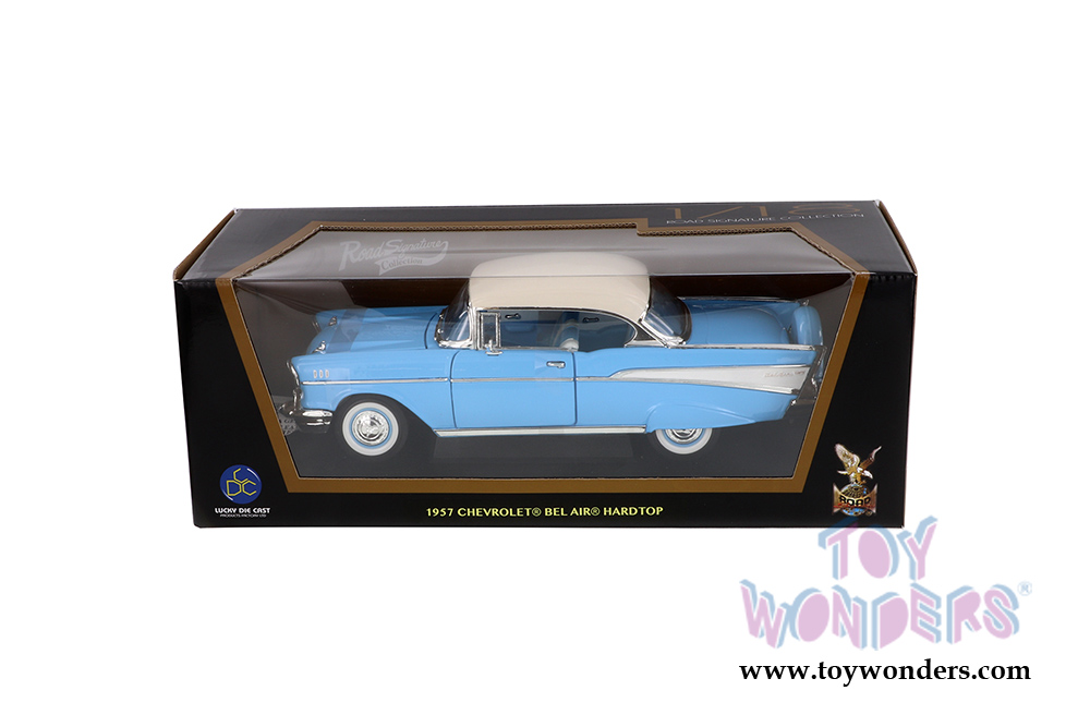 92109LBU Lucky Road Signature - 1957 Chevrolet® Bel Air® Hard Top. 1:18 scale diecast car. This 1957 Chevy Bel Air is an 11" long diecast with opening doors and hood and detailed engine & interior. This '57 Chevy® Bel Air® is manufactured by Lucky Die-Cast Products Factory LTD. Individually packed in a window box. Box size is 14"L x 5.75"W x 5.25"H. 92109LBU in Light BLUE color. GM is a trademark of the General Motors Corporation.