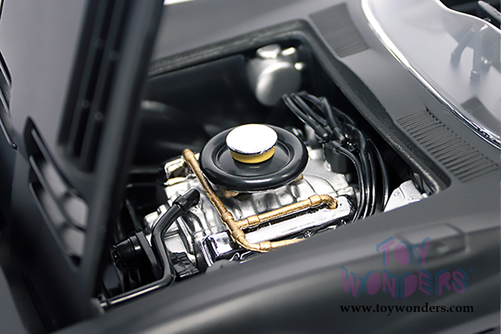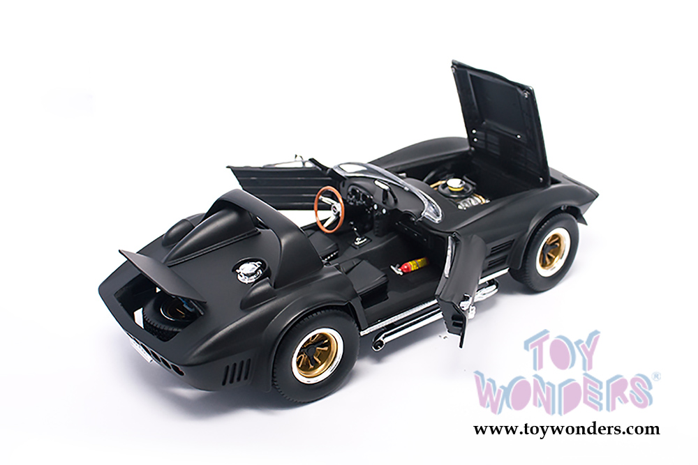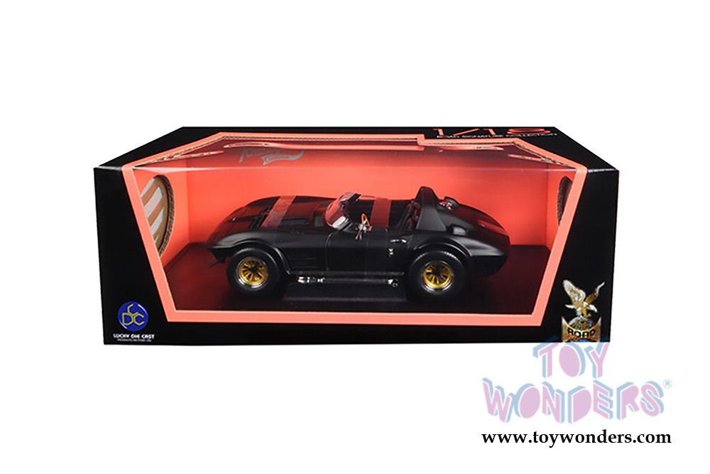 92697MBK Lucky Road Signature - 1964 Chevrolet® Corvette® Grand Sport Roadster. 1:18 scale diecast collectible model. This Chevy® Corvette® measures 10"L x 4"W x 3.5"H. Die-cast with openable doors, trunk and hood. Freewheels and workable steering. Detailed engine and components. This '64 Chevy® Corvette® is manufactured by Lucky Die Cast Products Factory LTD. Individually packed in a window box. Box is 14.75"L x 5.75"W x 5.25"H. Item 92697MBK is in Matte Black.