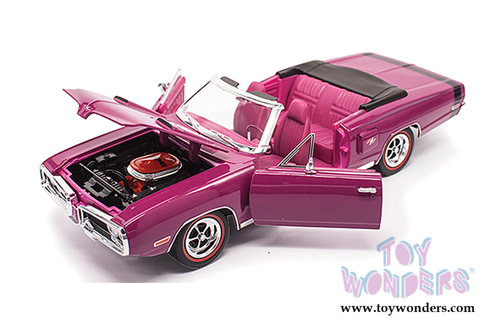 92548PR Lucky Road Signature - 1970 Dodge Coronet R/T Convertible. 1:18 scale diecast collectible model car. This Dodge Coronet is an 11"L x 4"W x 3"H diecast metal car with openable doors, detailed interior and exterior with freewheels. Road Signature collection. The '70 Dodge Coronet is manufactured by Lucky Die Cast Products Factory LTD. Item 92548PR is in PURPLE color. Individually packed in a window box. Box size: 14"L x 5.75"W x 5.25"H.