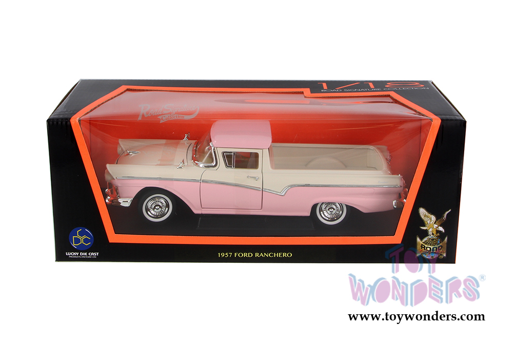 92208PK/12 Lucky Road Signature Ford Ranchero (1957) 1:18 scale. This classic pickup is 11"L x 4"W x 3.25"H. Die-cast metal car with free wheels, workable steering, openable doors, and hood. Highly detailed engine and components. Window box is 14"W x 5.25"H x 6"D. Manufactured by Lucky Die-Cast. 92208PK/12 in PINK and WHITE two-toned color.