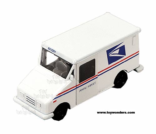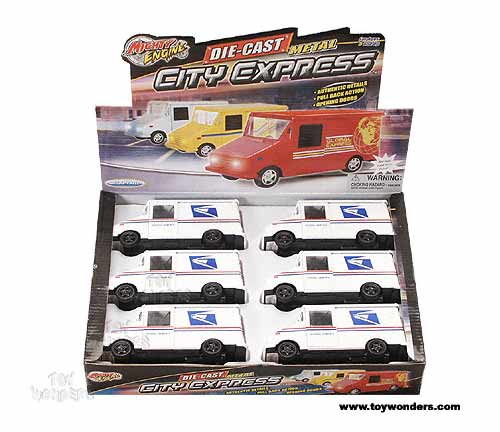 51180 Mail Truck. 5.75"L x 2"W x 2.5"H diecast metal, pullback action postal truck. Features sliding doors and a slide-away rear door. US Postal Service styling. Display box of 6 pcs.
