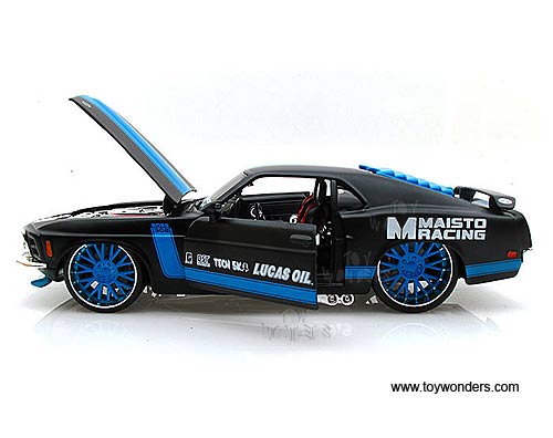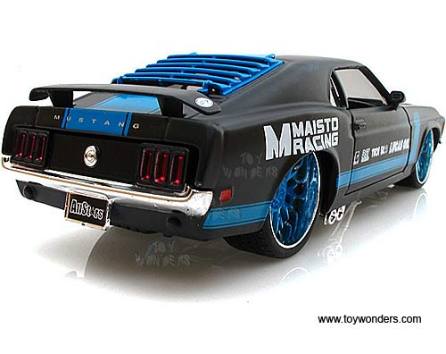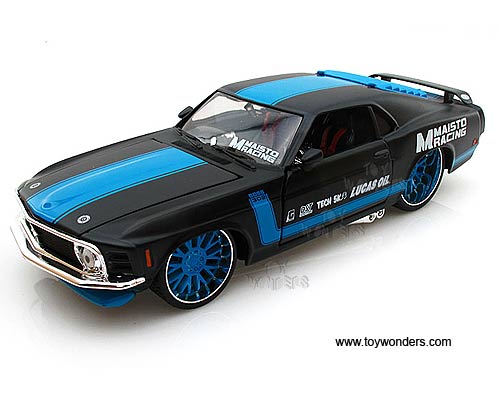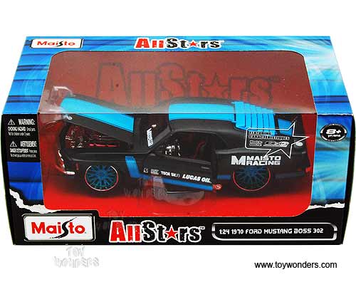 31329 Maisto All Stars - 1970 Ford Mustang Boss 302 Hard Top. 1:24 scale diecast collectible model car. This Ford Mustang Boss 302 is a 7.75"Lx 2.75"Wx 2"H die cast metal car with free wheeling, openable doors & hood. Each individually packed in a window box WB, and box size is 9.5"Lx 5.25"Wx 4.25"H. 31329 is in BLACK color with Blue stripes. This 70 Ford Mustang Boss 302 is manufactured by Maisto.