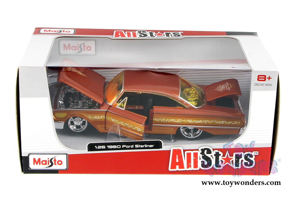 31038OR Maisto All Stars - 1960 Ford Starliner Hardtop. 1:26 scale diecast collectible model car. This Ford Starliner is a 7.5"L x 3"W x 2.25"H diecast metal car with freewheeling, openable doors, trunk, and hood. Each individually packed in a window box. Window Box size is 9.75"L x 5.25"W x 4.5"H. 31038OR is in ORANGE color. This 1960 Ford Starliner is manufactured by Maisto.