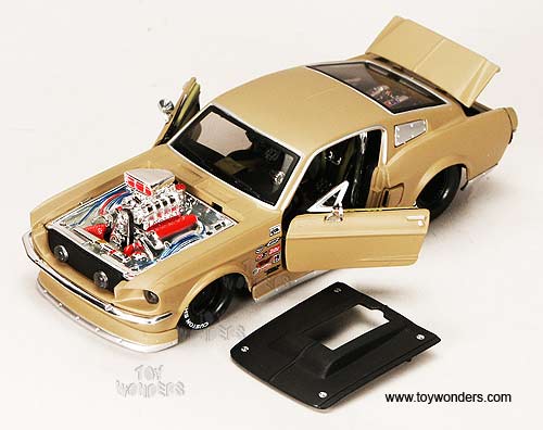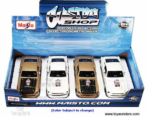 34317 Maisto Custom Shop - 1967 Ford Mustang GT Hard Top w/ Engine Blower. 1:24 scale diecast collectible model car. This Ford Mustang GT is a 7.5"L x 3"W x 2"H die cast metal car with openable doors, hood & trunk. Free wheeling. This Ford Mustang GT is manufactured by Maisto. 4 pcs per display box in assorted colors.