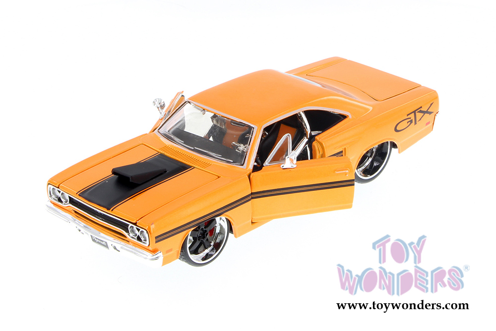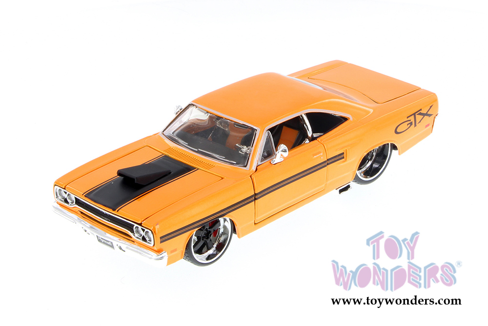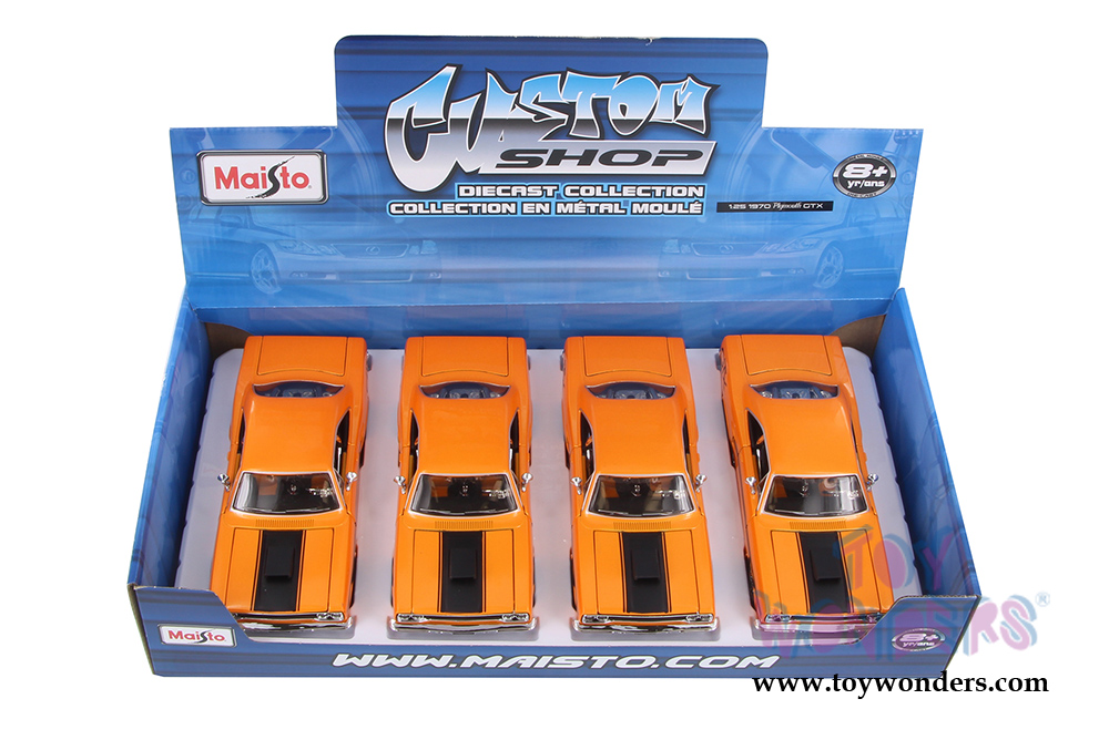 34016 Maisto Custom Shop - 1970 Plymouth GTX Hardtop. 1:25 scale diecast collectible model car. This Plymouth GTX is an 8"Lx 3"Wx 2.5"H diecast metal car with openable doors, hood, and trunk. The Plymouth GTX is manufactured by Maisto. 4 pcs per display box in ORANGE color.
